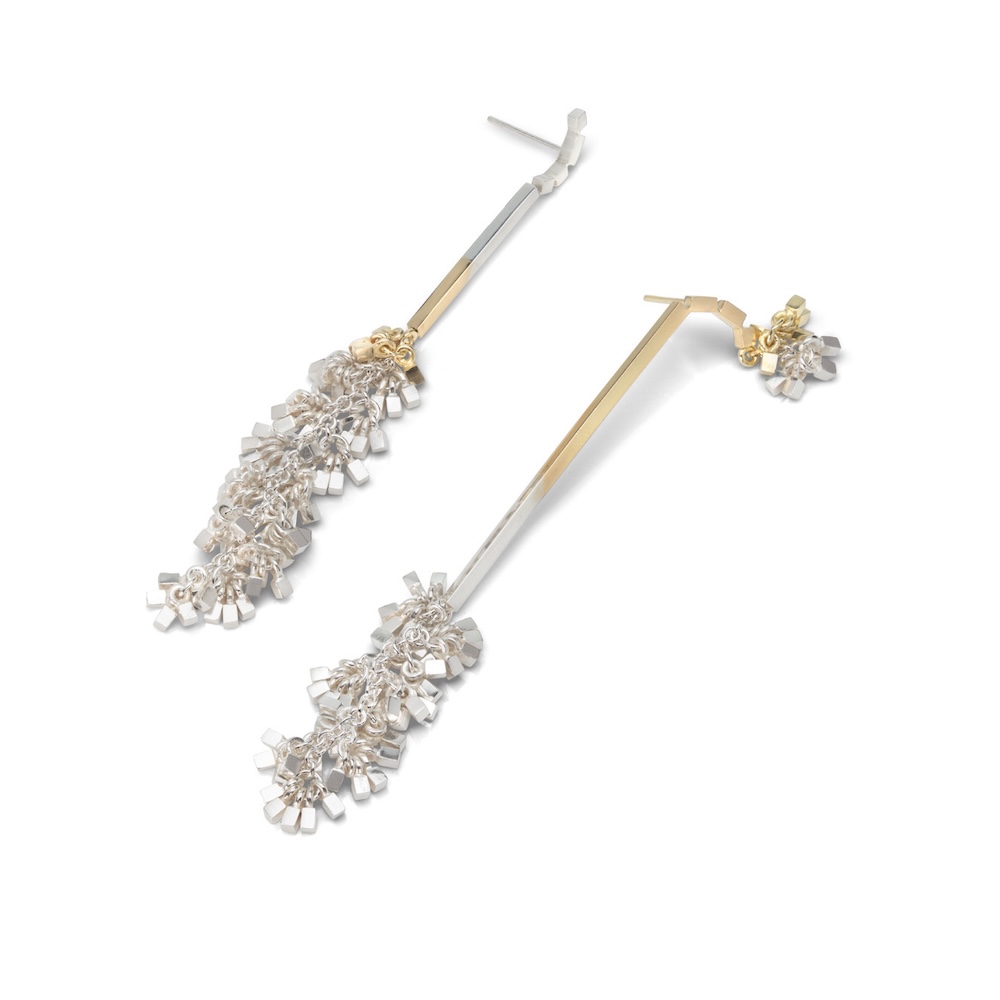 Description - Long silver and gold drop earrings with a 'broken' length of square wire terminating in a shaggy cluster of cubes. These are arranged in groups of 5 creating a wonderful pattern with contrast and movement.