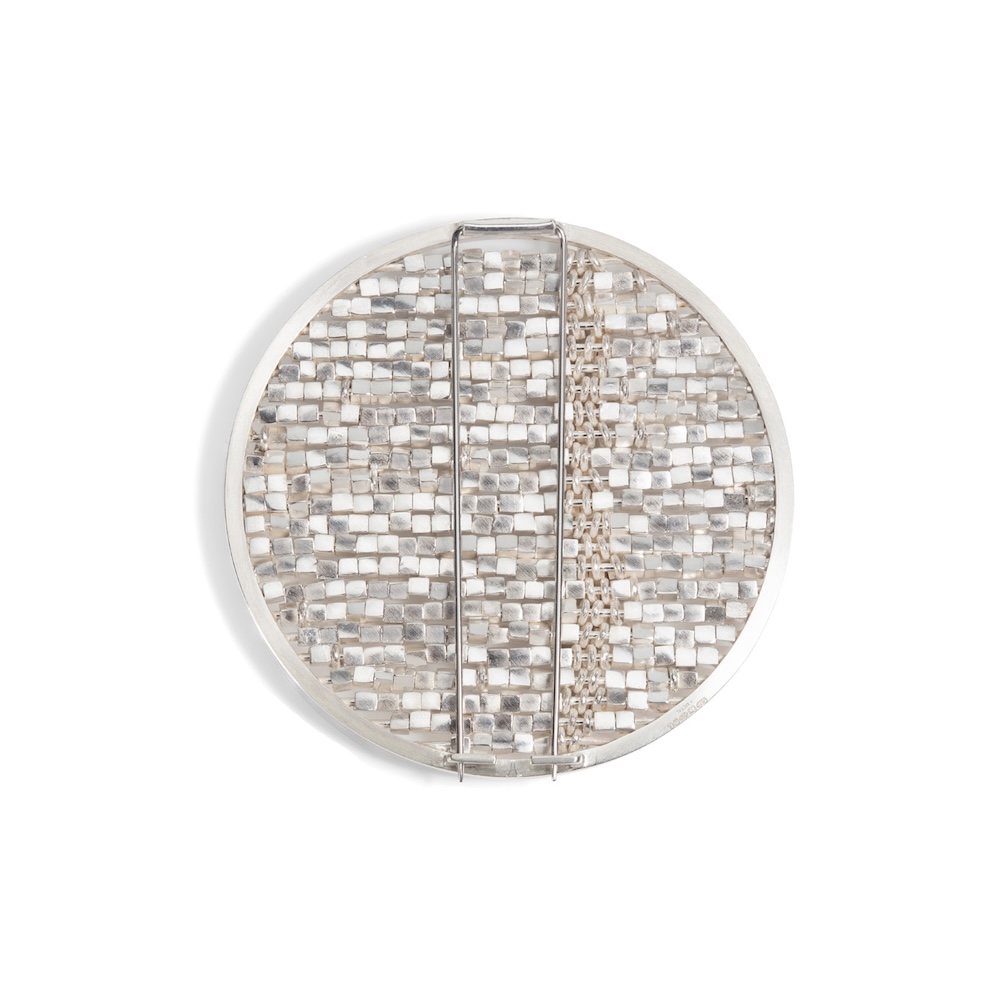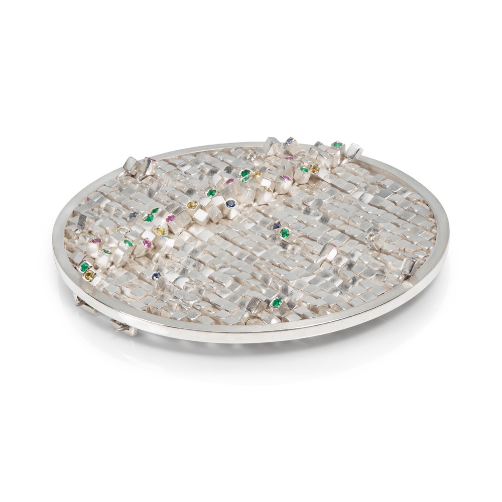 Description - A circular silver brooch with multiple rows of cubes, some drilled through, some raised on rings, which move individually creating an undulating surface. The faces of some of the cubes are set with emeralds, diamonds and sapphires.