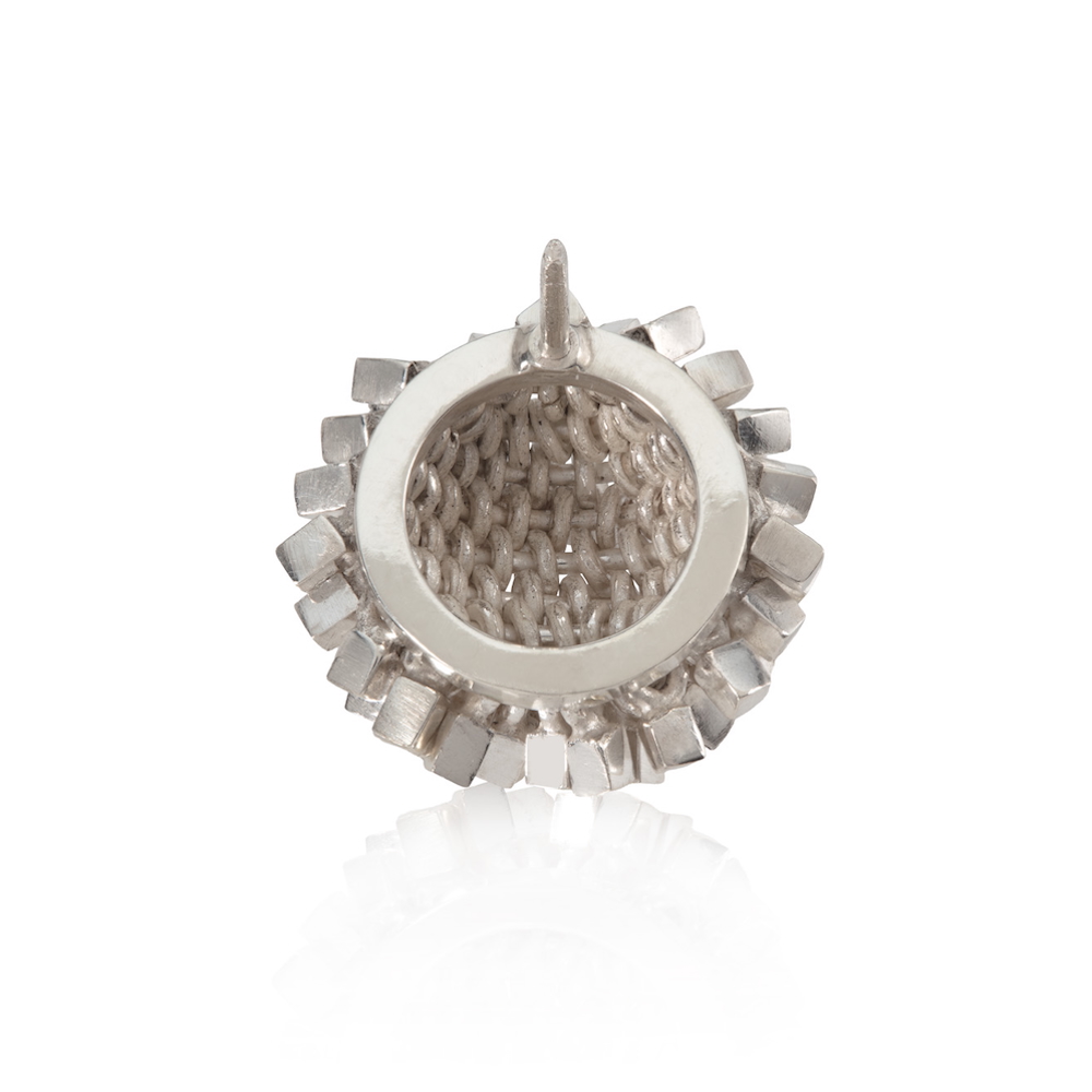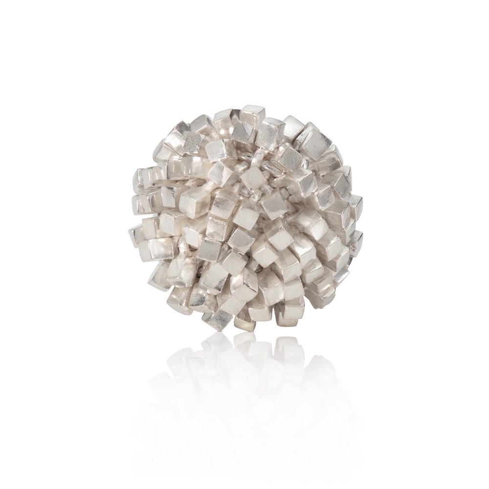 Description - a semi spherical silver pin composed of wires carrying cubes, all of which move individually. Materials - silverDimensions - individual cube size 2mm x 2mm - diameter 15mm.